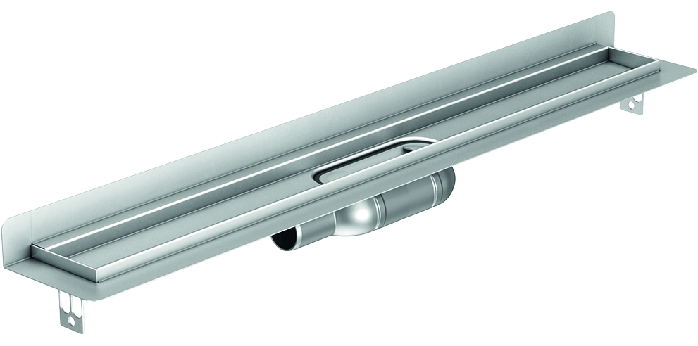 Aco COMFORT Normál beépítési magasságú folyóka falszigetelő gallérral, vízszintes párhuzamos csőcsatlakozással (BAL oldali kivezetés)